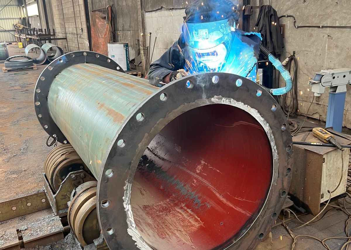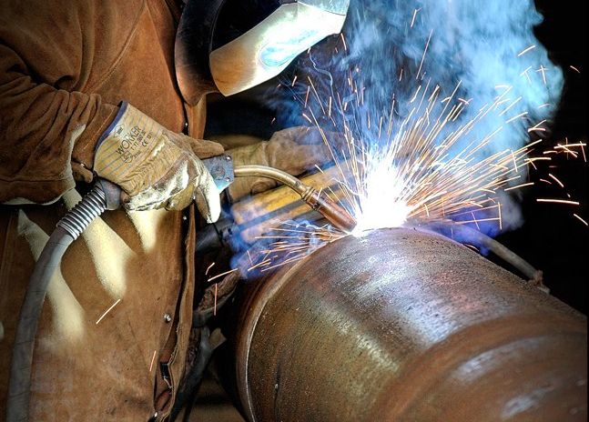 performing welding construction work on steel tubes.